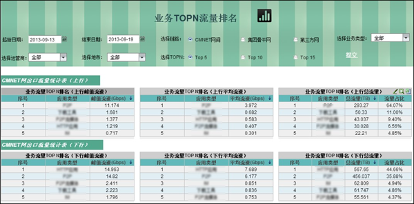 数据服务作为数据存储和处理软件,每日完成3000万条数据的存储。数据服务BI作为分析平台,完成流量流速统计、网间出口流量统计(分地市)、网间出口流量流向统计、网间出口流量的流向统计(分运营商分省)、网间出口流量业务量统计、网间出口流量的业务量统计(分地市)、业务TOPN流量排名、业务TOPN具体应用流量排名、热点域名TOPN排名、单IP流速TOPN排名等分析。