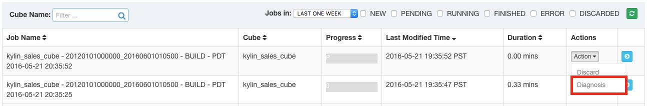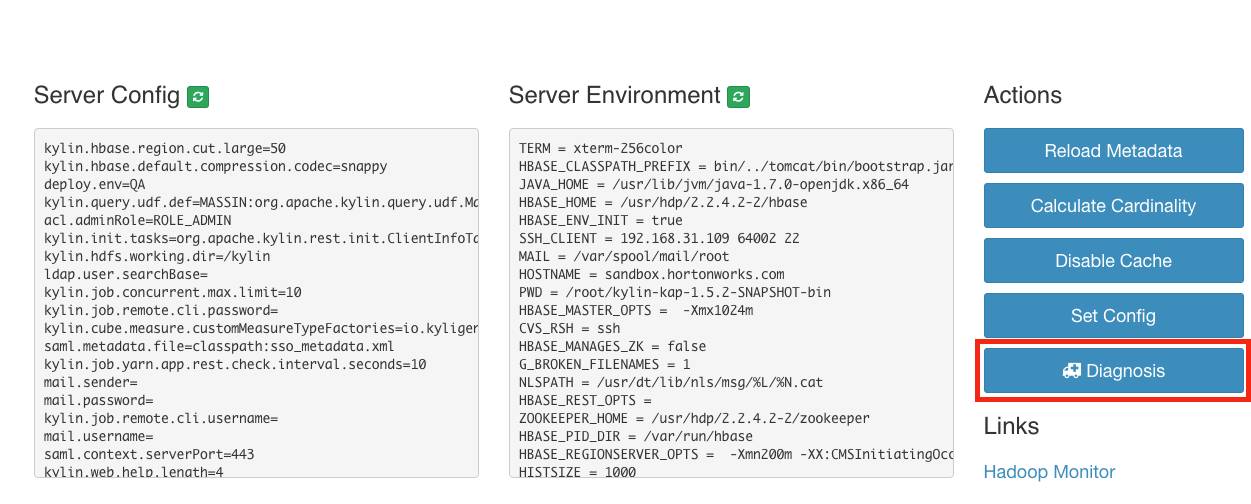 当用户遇到查询、Cube/Model管理的问题,单击System页面的Diagnosis按钮,系统会自动抓取当前Project相关的信息并打包成zip文件下载到用户本地。这个包会包含相关的Metadata、日志、HBase配置等。当用户需要在mailing list求助,也可以附上这个包。当一个cube构建任务执行失败或时间过长,用户可以单击Job下的Diagnosis按钮。同样的,系统会抓取和下载Job相关信息成一个zip包。