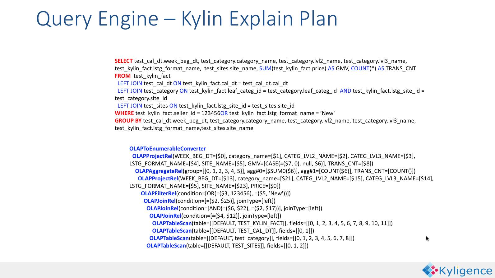 有了这些预计算的结果,当收到用户的SQL请求,Kylin会对SQL做查询计划,并把本该进行的Join、Sum、Count Distinct等操作改写成Cube的查询操作。