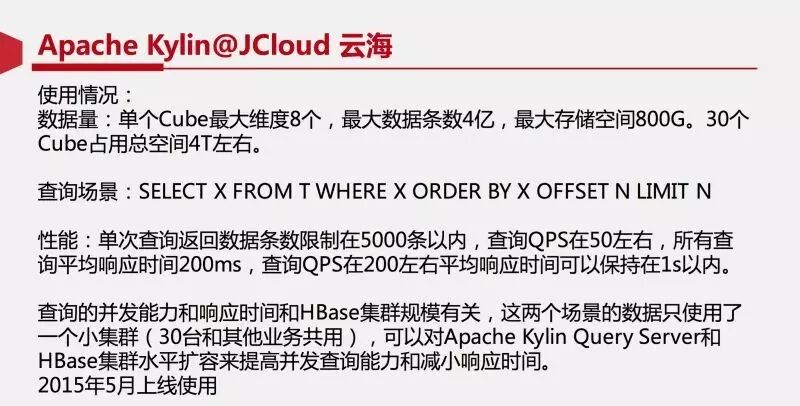 根据公开数据显示,Kylin的查询性能不只是针对个别SQL,而是对上万种SQL 的平均表现,生产环境下90%ile查询能够在在3s内返回。在上个月举办的Apache Kylin Meetup中,来自美团、京东、百度等互联网公司分享了他们的使用情况。例如,在京东云海的案例中,单个Cube最大有8个维度,最大数据条数4亿,最大存储空间800G,30个Cube共占存储空间4T左右。查询性能上,当QPS在50左右,所有查询平均在200ms以内,当QPS在200左右,平均响应时间在1s以内。