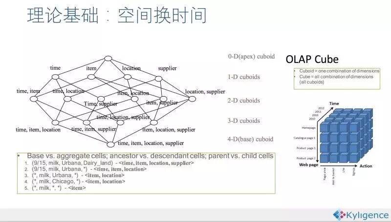 上图所示就是一个Cube的例子,假设我们有4个dimension,这个Cube中每个节点(称作Cuboid)都是这4个dimension的不同组合,每个组合定义了一组分析的dimension(如group by),measure的聚合结果就保存在这每个Cuboid上。查询时根据SQL找到对应的Cuboid,读取measure的值,即可返回。