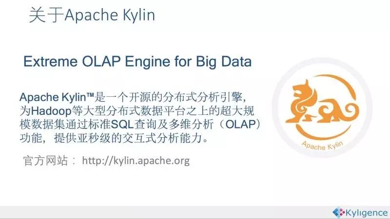 Apache Kylin,中文名麒(shen)麟(shou) 是Hadoop动物园的重要成员。Apache Kylin是一个开源的分布式分析引擎,最初由eBay开发贡献至开源社区。它提供Hadoop之上的SQL查询接口及多维分析(OLAP)能力以支持大规模数据,能够处理TB乃至PB级别的分析任务,能够在亚秒级查询巨大的Hive表,并支持高并发。