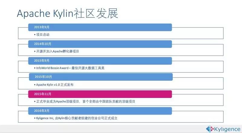 Apache Kylin于2014年10月在github开源,并很快在2014年11月加入Apache孵化器,于2015年11月正式毕业成为Apache顶级项目,也成为首个完全由中国团队设计开发的Apache顶级项目。于2016年3月,Apache Kylin核心开发成员创建了Kyligence公司,力求更好地推动项目和社区的快速发展。