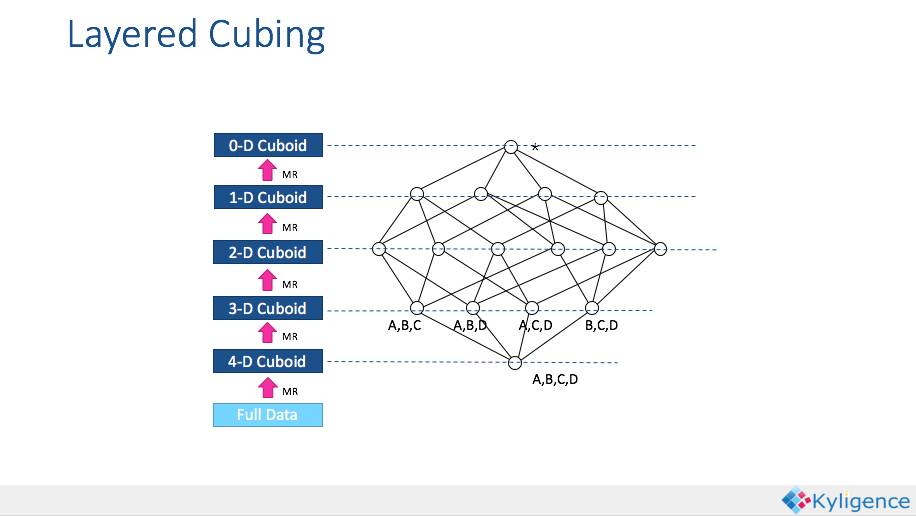 说到Cube的构建,Kylin提供了一个称作Layer Cubing的算法。简单来说,就是按照dimension数量从大到小的顺序,从Base Cuboid开始,依次基于上一层Cuboid的结果进行再聚合。每一层的计算都是一个单独的Map Reduce任务。如下图所示。