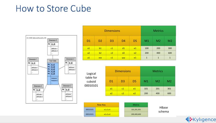 MapReduce的计算结果最终保存到HBase中,HBase中每行记录的Rowkey由dimension组成,measure会保存在column family中。为了减小存储代价,这里会对dimension和measure进行编码。查询阶段,利用HBase列存储的特性就可以保证Kylin有良好的快速响应和高并发。