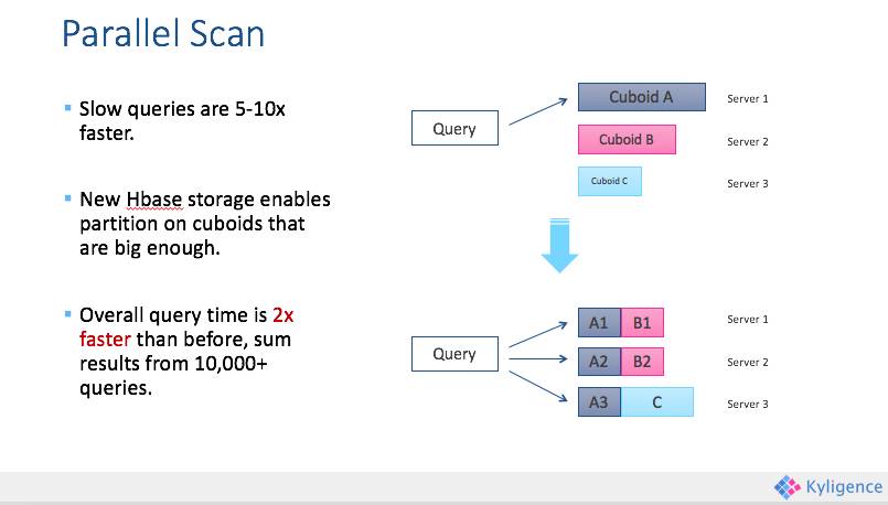 在Kylin 1.5.x中还对HBase存储结构进行了调整,将大的Cuboid分片存储,将线性扫描改良为并行扫描。基于上万查询进行了测试对比结果显示,分片的存储结构能够极大提速原本较慢的查询5-10倍,但对原本较快的查询提速不明显,综合起来平均提速为2倍左右。