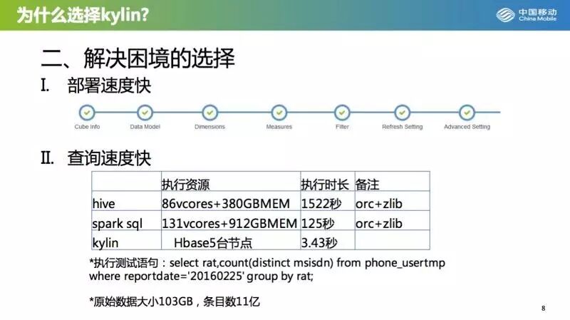 北京移动也在meetup上展示了Kylin在电信运营商的应用案例,从数据上看,Kylin能够在比Hive/SparkSQL在更弱的硬件配置下获得更好的查询性能。