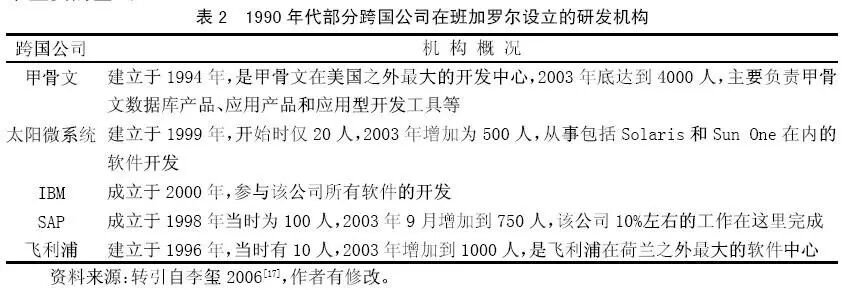 进入21世纪以来,跨国研发投资的注入出现新的特征。跨国公司在班加罗尔修建的研发中心通常都比在其他国家和地区的研发中心规模大,而且从事的工作也更为重要,越来越多的中心从最初为母国同类机构提供支持转向当前的受命研发整体产品。在此过程中,既培养了众多具有国际水准与视野的本地研发人才,同时也为围绕在其周围的本地软件服务商提供了大量的研发外包合同。