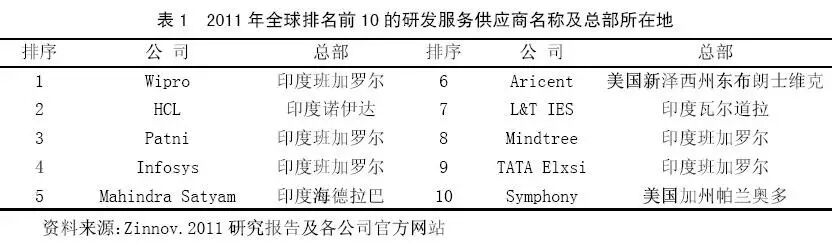 被誉为“印度硅谷”的班加罗尔是印度服务外包业迅速发展的一个缩影,这一地区占据着印度软件出口总额的三分之一。班加罗尔不仅是印度软件出口的策源地,同时在研发服务业方面也越来越专业化[7]。根据全球著名创新研究机构Zinnov发布的2011年度全球研发服务供应商排行榜,在排名前10的公司中,有多达5家公司的总部位于班加罗尔(表1),充分说明了班加罗尔在全球研发服务业格局中所占据的重要地位[8]。因此,本文以全球价值链的相关理论为支撑,以班加罗尔作为研究案例,一方面系统回顾该地区从软件外包到研发服务业的发展轨迹,另一方面对驱动班加罗尔服务外包业升级的主要因素进行分析与归纳。