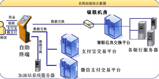 如上图所示,系统包含顾客自助终端、加油站服务器、银联信息交换平台、支付宝微支付交易平台四大模块,实现以下功能: