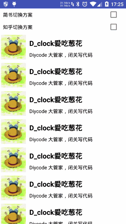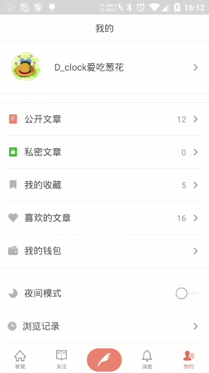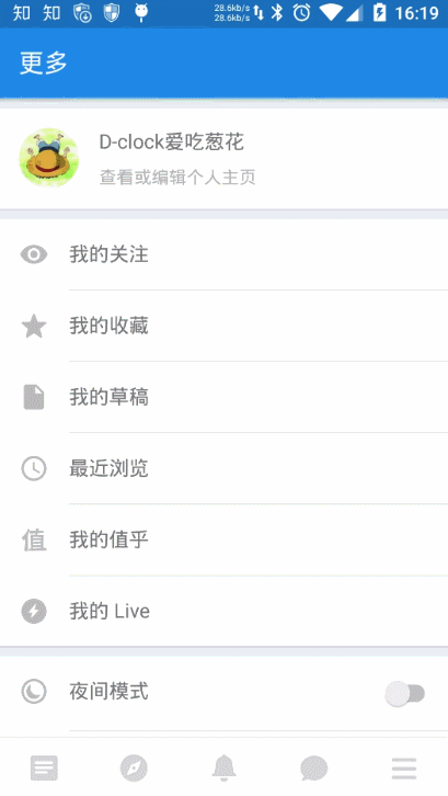 好了,回归正题,说回夜间模式。在网上看到很多童鞋都说用什么什么框架来实现这个功能,然后仔细去看一下各个推荐的框架,发现其实都是动态换肤的,动态换肤可比夜间模式要复杂多了,未免大材小用了。说实话,我一直没用什么好思路,虽然网上有童鞋提供了一种思路是通过 setTheme 然后再 recreate Activity 的方式,但是这样带来的问题是非常多的,看起来就相当不科学(为什么不科学,后文会说)。于是,直接想到了去逆向分析那些夜间模式做得好的应用的源代码,学习他们的实现套路。所以,本文的实现思路来自于编写这些应用的夜间模式功能的童鞋,先在这里向他们表示感谢。我的手机里面使用高频的应用不少,其中简书和知乎是属于夜间模式做得相当 nice 的。先给两个效果图大家对比感受下