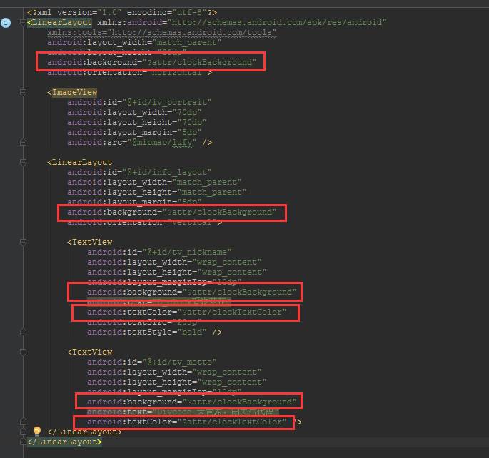 需要注意的是,上面的 clockTextColor 和 clockBackground 是我自定义的 color 类型属性