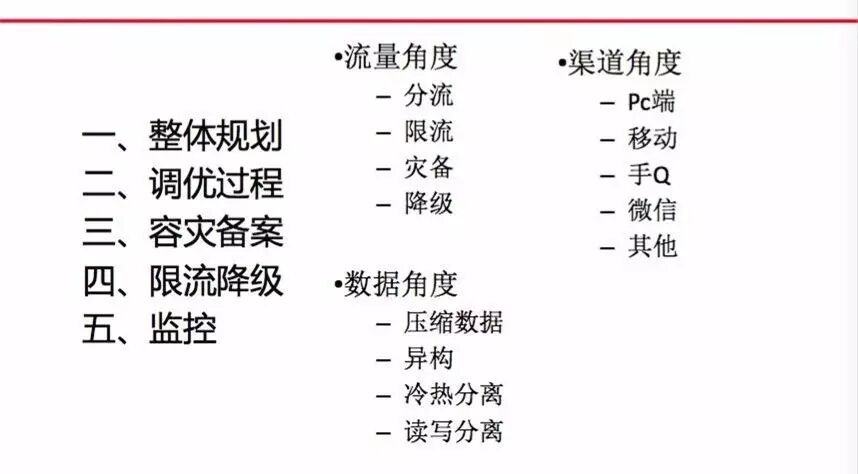 下面我会详细讲618、双11备战后面,每一年所做的不同改变。这是一个整体的大概分析,我们从哪些方面做优化,去提高系统的容灾性,提高系统应对峰值流量的能力。