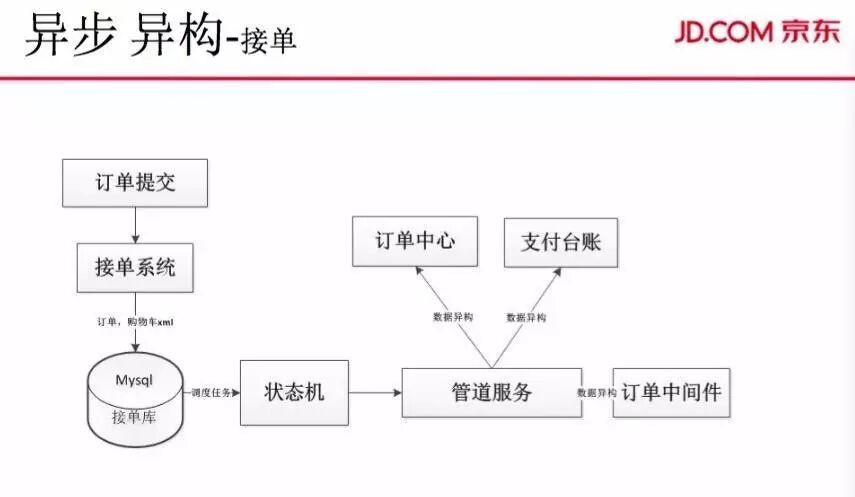 接下来讲讲接单的异步。提交订单,提交一次订单原来需要写10多张表。当订单量提高到一分钟10万的时候,系统就无法承受。我们就把整个提交订单转成XML,这样只写一张表,后面再去做异步。接单的第一步,先是把整个订单所有信息存储下来,然后再通过状态机异步写原来的10多张表数据。