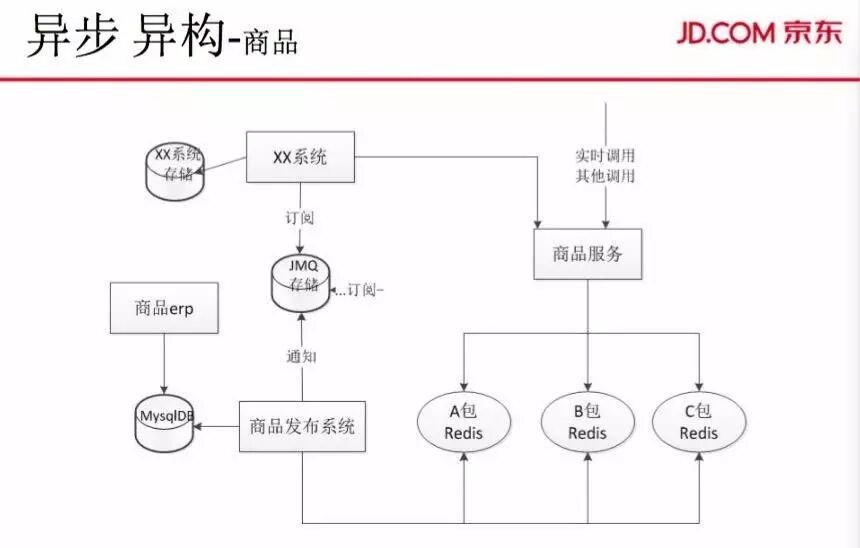 比如,针对促销系统调用,促销系统主要调用特殊属性,我们把这些属性存到促销系统的特有存储。库存系统也类推。调用的特殊属性的方法也不一样。譬如大家电的长宽高这些特有属性,不像前端商品页里只是基本属性。这样就把所有的属性异构处理,针对商品纬度、商品ID等所有数据会异构一份到库存、促销、单品页,后面进行改造的时候,又将数据分A包、B包、C包。