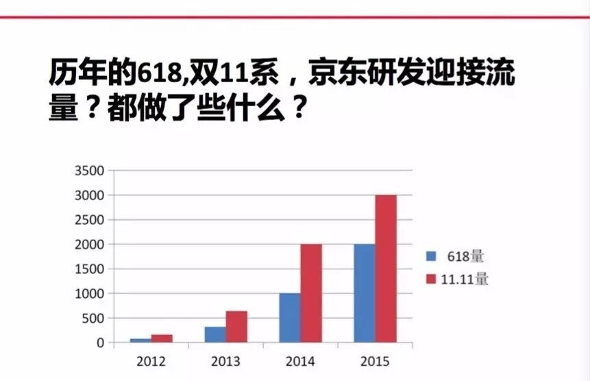 如下图所示,2011年京东的订单量是30万,2015年订单量就已经到了3000多万,京东的流量每年不断地翻倍。订单从30万到100万是三倍增长,实际上访问流量的翻番,可能是10倍、50倍,甚至上百倍。