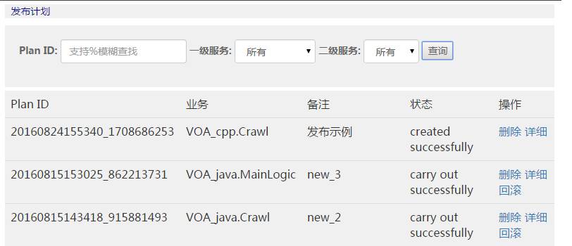 接着,点击菜单 “运维->发布”,可以查询所有发布计划,对于已经发布的计划,可以做回滚操作。点击详情可以查看发布计划更详细信息,并执行发布: