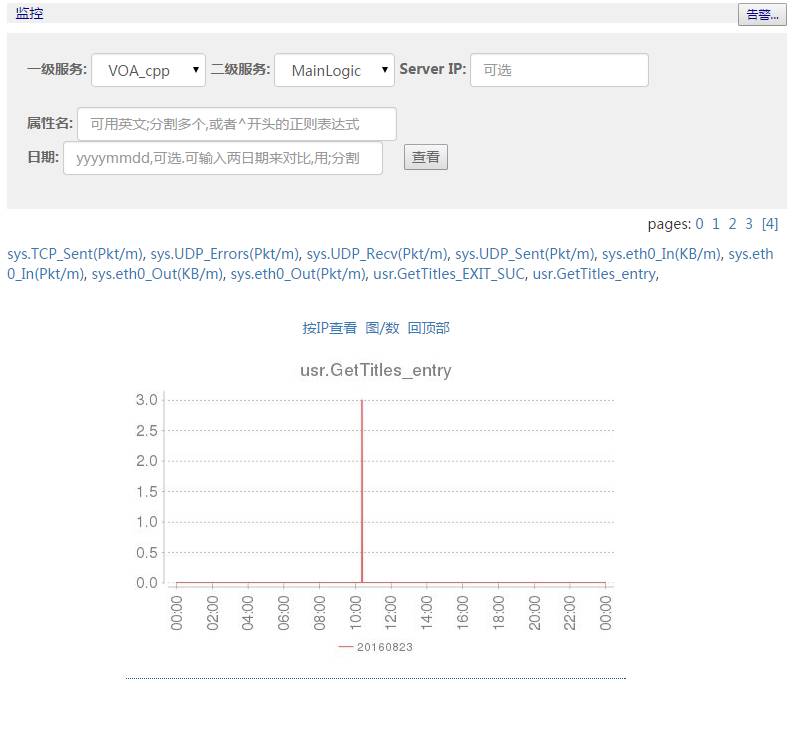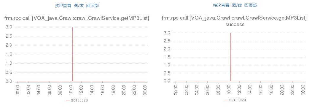 毫秒引擎框架本身,在RPC执行的时候,就上报了很多基础属性和日志,这样保证了服务监控和告警等运营措施不依赖与人的意识。下图是叫做getMP3List这样一个RPC调用的请求数和成功数,这些是不需要业务开发者工作就自动上报。