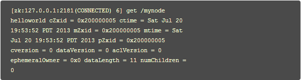 您会发现,在获取一个 znode 数据时,客户端也返回了一些与 znode 有关的元数据。此元数据中的一些重要字段包括,与创建和最后修改 znode 的时间有关的阶段时间戳(ctime 和 mtime)、每次修改数据都会更改的数据版本(dataVersion)、数据长度(dataLength)、这个 znode 的子节点的数量(numChildren)。我们现在可以删除 znode。