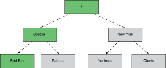 ZooKeeper 有一个类似于文件系统的数据模型,由 znodes 组成。可以将 znodes(ZooKeeper 数据节点)视为类似 UNIX 的传统系统中的文件,但它们可以有子节点。另一种方式是将它们视为目录,它们可以有与其相关的数据。每个这些目录都被称为一个 znode。图 2 显示的图代表与两个城市中的运动队相同的层次结构。