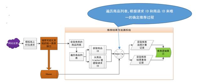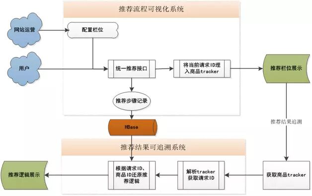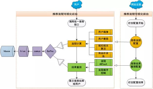 从图4可以看出,通用推荐平台总共包含两个系统,分别为推荐流程可视化系统、推荐结果可追溯系统。在推荐流程可视化系统里,网站运营提前做好推荐栏位配置,然后用户在访问已配置完毕的栏位时候,请求流程可视化系统中的统一推荐接口,在接口逻辑处理的过程中,会将推荐步骤通过数据回流系统写入到HBase中,供推荐结果可追溯系统使用;在推荐结果可追溯系统里,通过模拟线上栏位请求,根据请求ID和商品ID去回溯推荐过程,判断推荐过程是否有理有据。