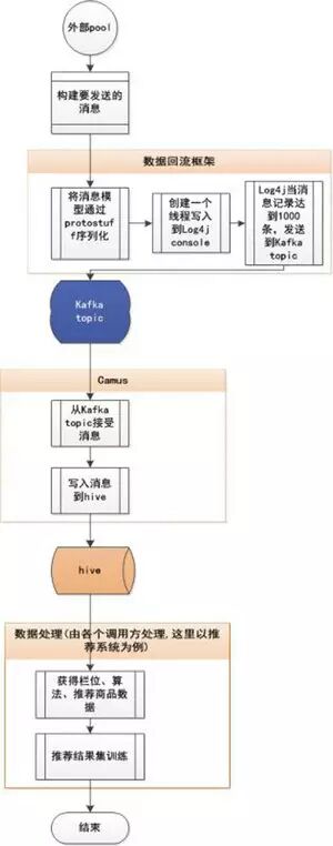 在计算的过程中,自主研发的数据回流系统将推荐步骤通过Kafka、Camus发送到Hive中,然后经过数据清洗等步骤落入到HBase中。数据回流系统的流程图如图6所示。