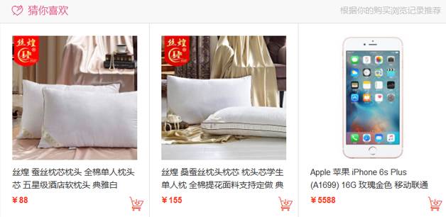 在传统电商网站中,给用户推荐商品的栏位丰富多彩。例如在一号店PC端首页会根据用户的购买记录推荐用户可能感兴趣的商品,我们称之为猜你喜欢栏位,如图1所示。