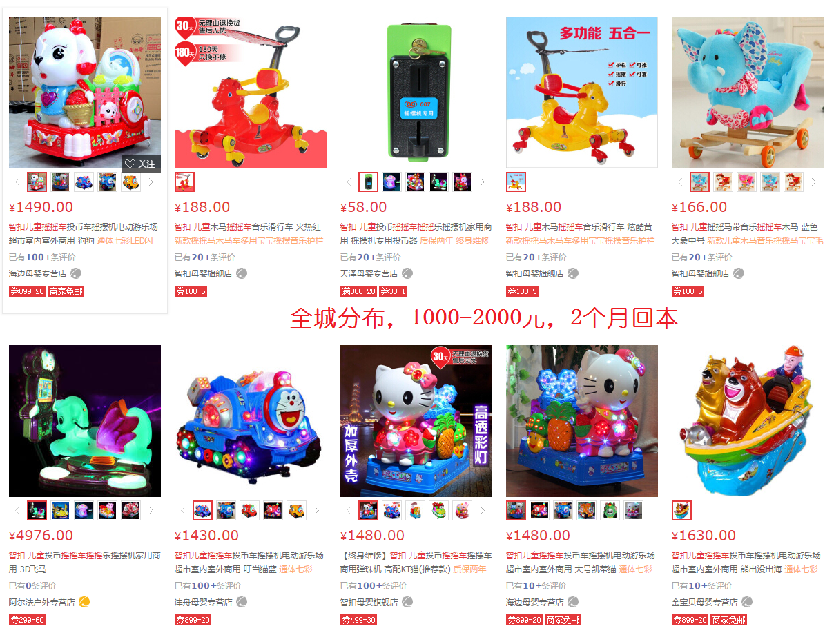 一方面,摇摇车作为互动感极强的儿童娱乐设备深受小朋友的喜欢,已经在各大便利店、小卖部、商场普及,验证了市场需求,平均一台1000-2000元的摇摇车在2个月内就可以回本,一年利润4-5倍