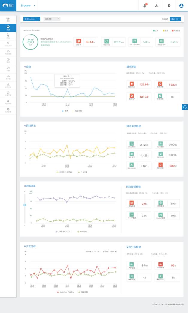 在产品真正上线后可以及时进行崩溃分析、网络请求与错误分析,交互分析等等通过App的总体性能评分与在同行业竞争中所处的位置来不断迭代产品,改进用户体验。
