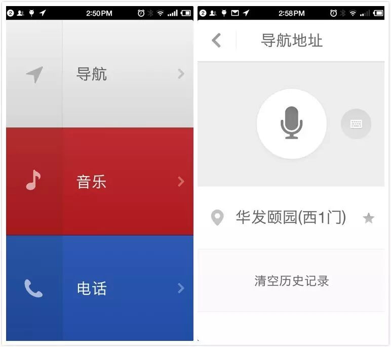 选中导航后优先用语音搜索目的地,这样可以减少对驾驶的影响。下方巨大的List也让用户比较容易的去点击最近去过的地方。这样就非常符合用户在驾驶中,或者说非手持状态的使用习惯。