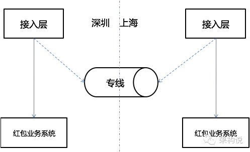 订单落在深圳,上海用户抢红包,在上海接入后通过专线跨城到深圳,最后在深圳闭环完成抢红包。