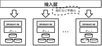 按红包订单划分逻辑单元,单元内业务闭环。服务rpc调用时,使用红包订单号的hash值为key寻找下一跳地址。对同一个红包的所有拆请求、查询请求,都路由到同一台逻辑机器、同一台DB中处理。