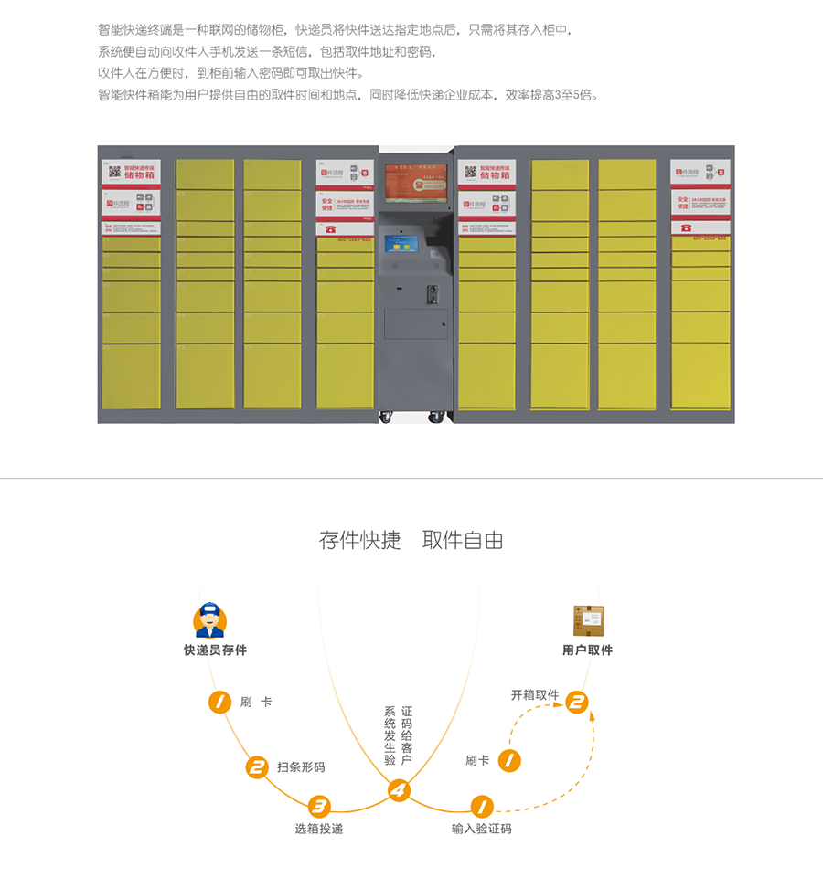 •智能快递柜系统包括(后台数据管理中心,寄存柜终端操作系统,寄存柜终端升级服务),性价比超值,涵盖除邮寄功能以外所有快递业务,拥有完善的异常处理分支,丰富的硬件接口功能,强大的后台管理。